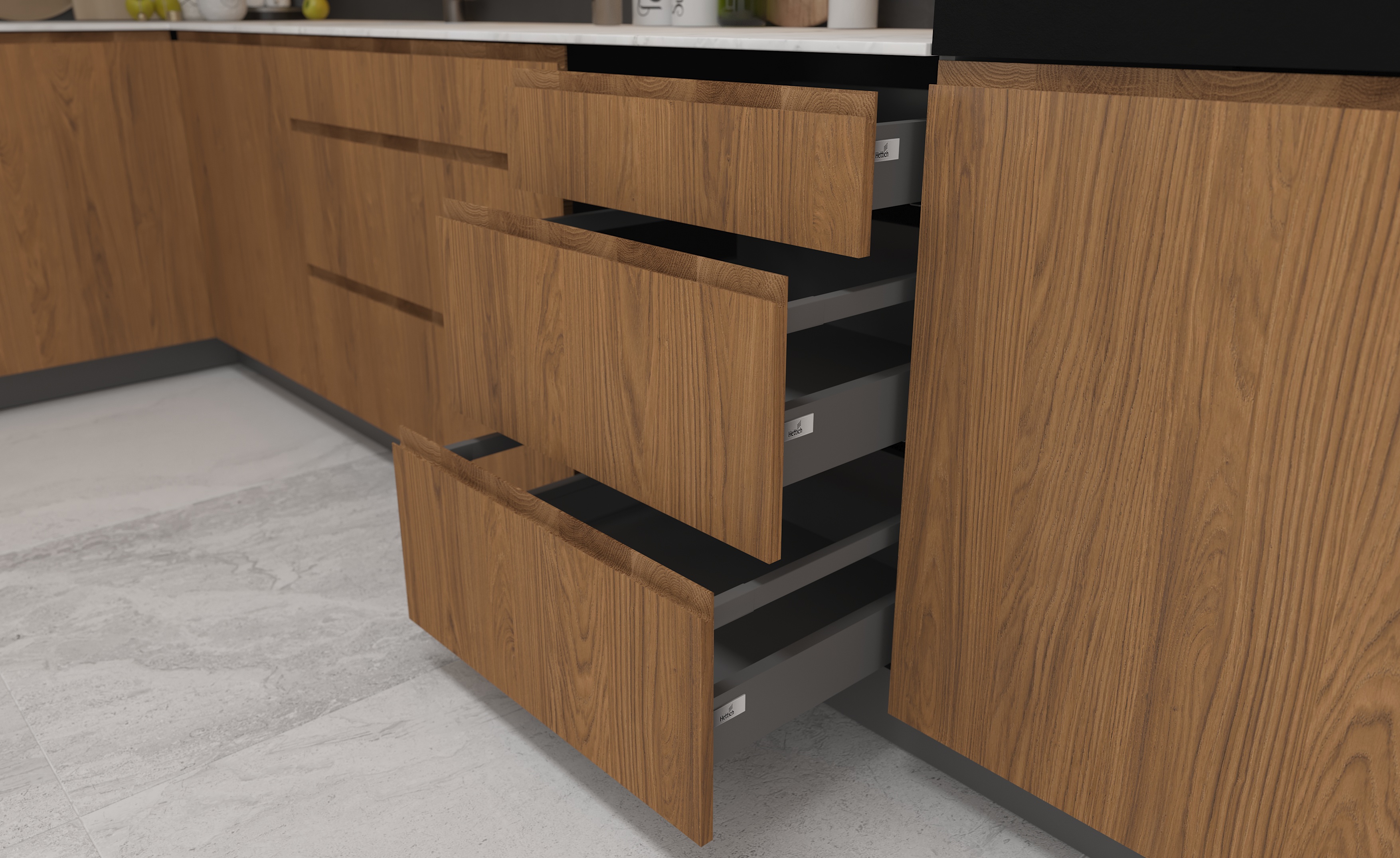 Precizní výsuvy Hettich Atira na principu kuličkových ložisek, s naprosto přesnými dráhami pro chod zásuvky, zaručují ojedinělý komfort. Výsuv je elegantně skrytý pod dnem zásuvky, která se vysouvá téměř v celé své hloubce. Díky tomu pohodlně a elegantně využijete celý prostor v zásuvce. Tlumené dovírání zásuvky s dobržděním je samozřejmostí.