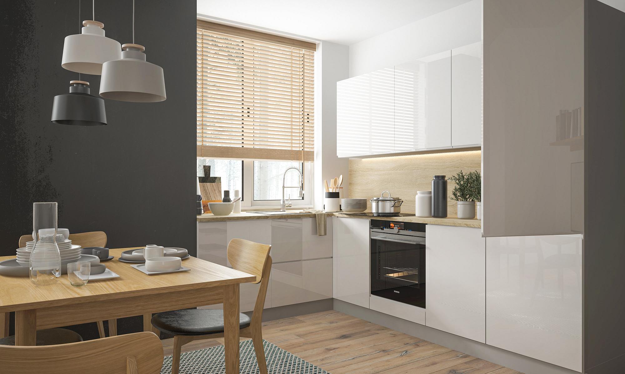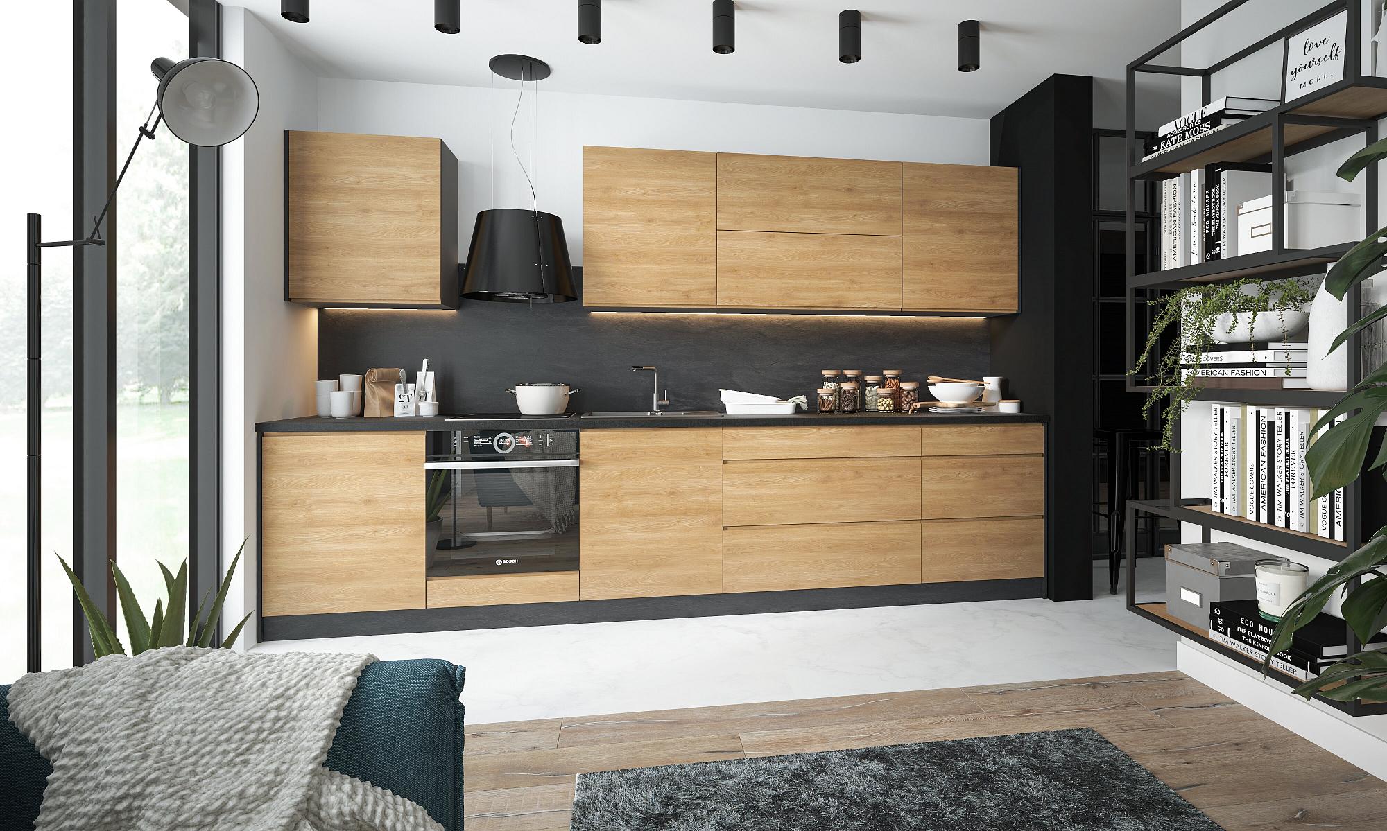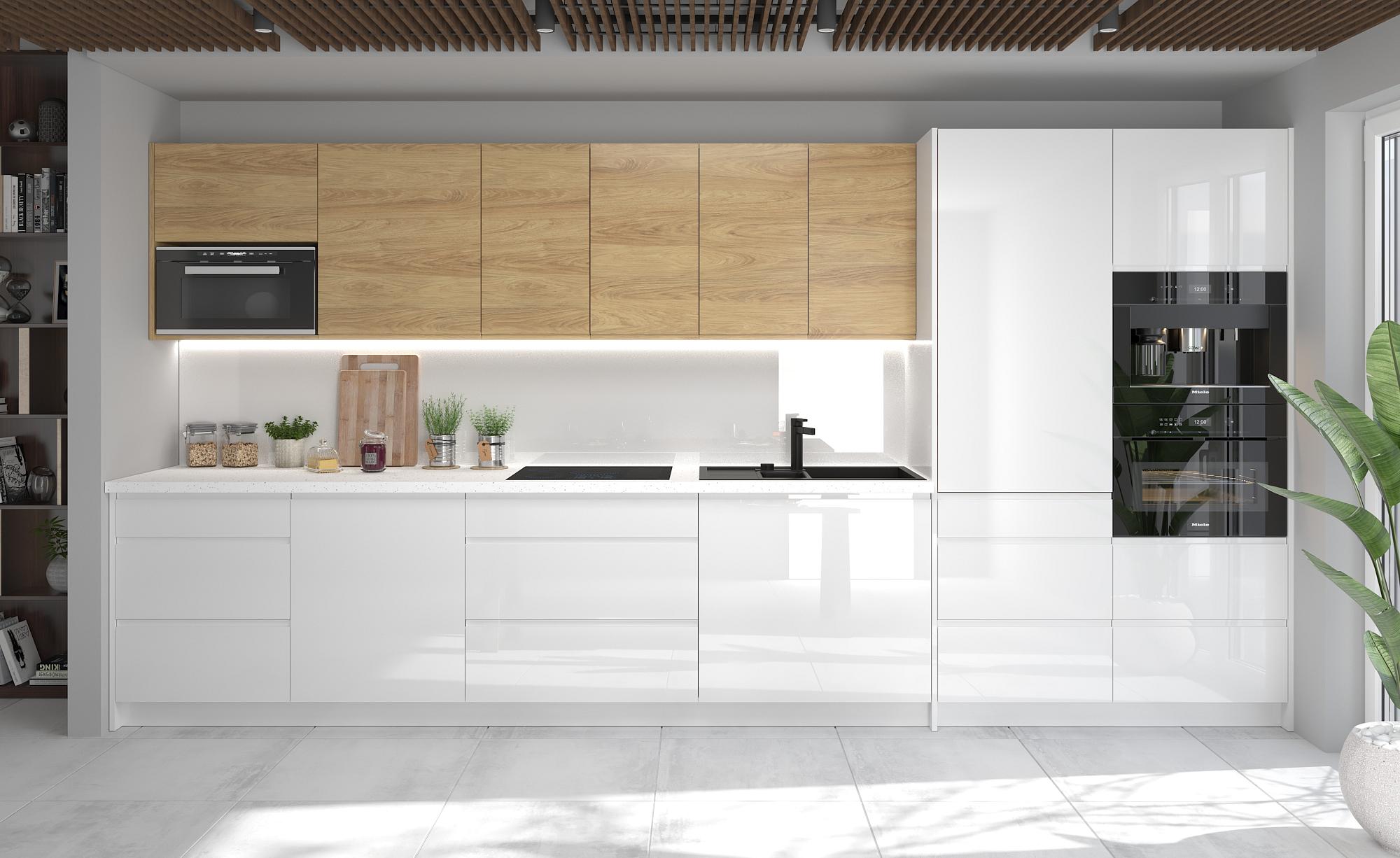Moderní kuchyňské linky s bezúchytkovými dvířky. Vybírejte z oblíbených dekorů dřeva, které můžete kombinovat s akrylovými dvířky v leském nebo matném provedení.