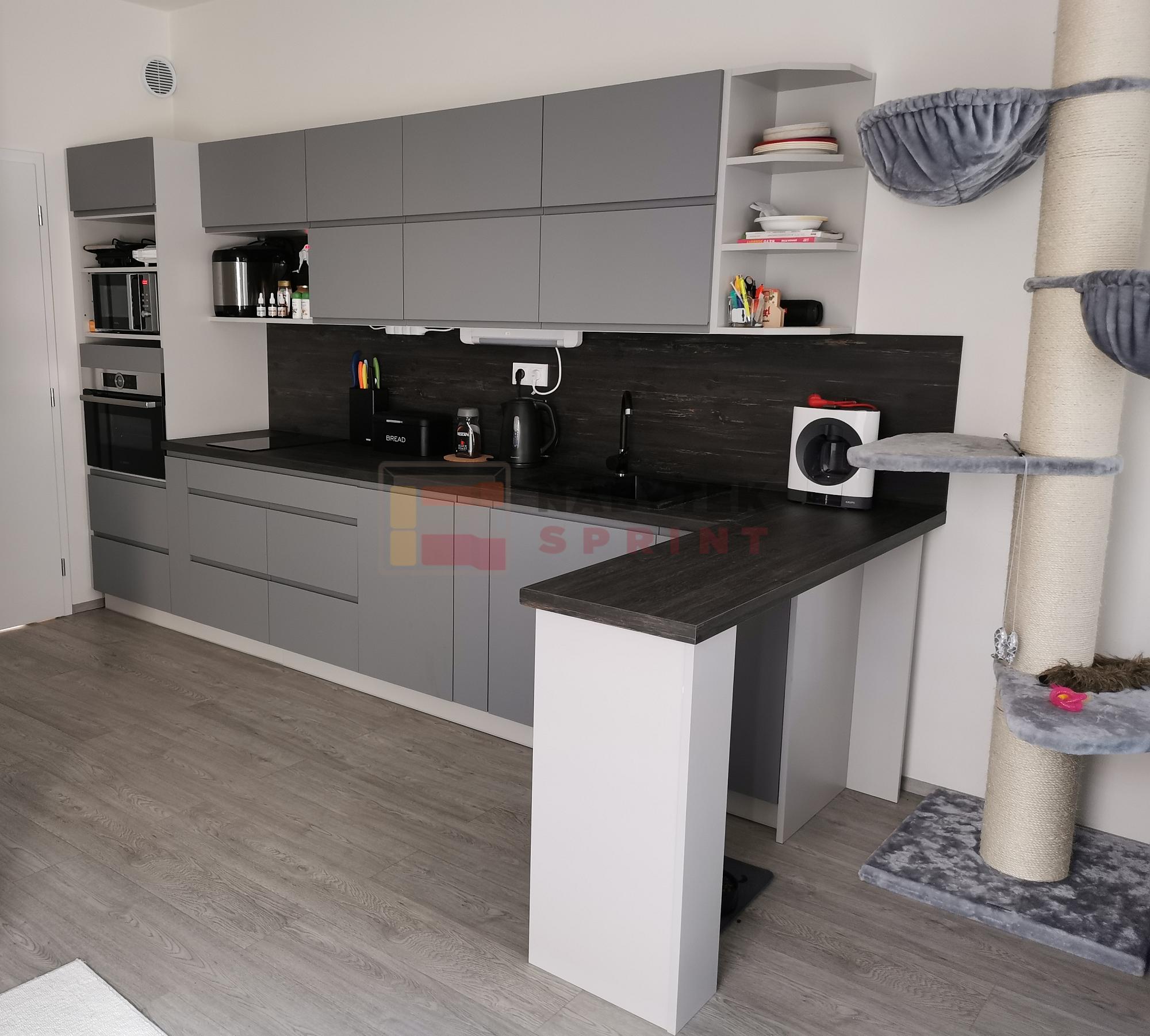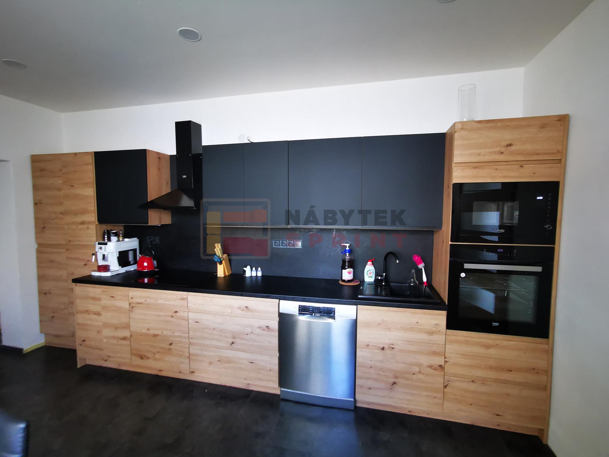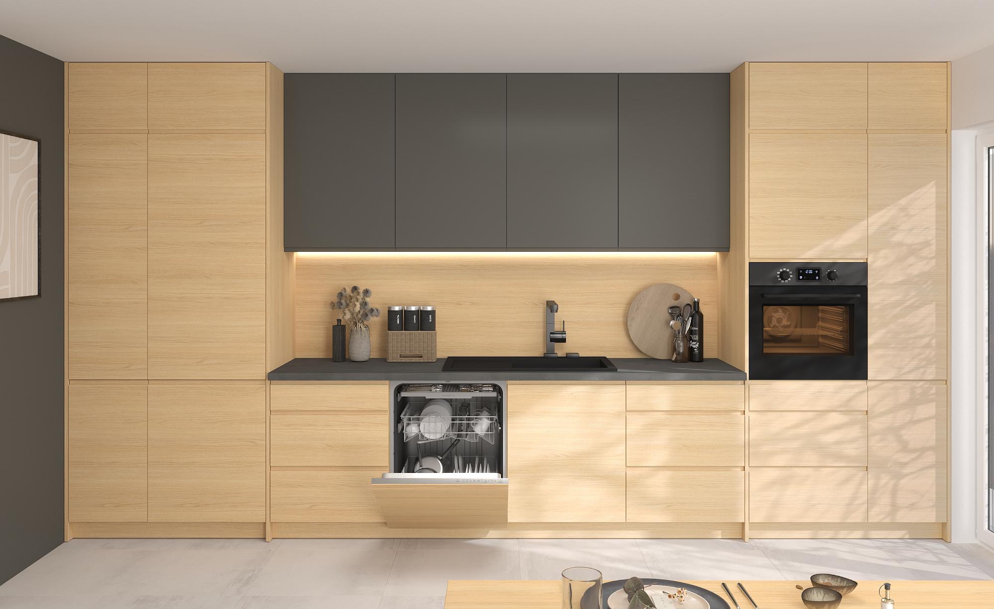Moderní kuchyňské linky s bezúchytkovými dvířky. Vybírejte z oblíbených dekorů dřeva, které můžete kombinovat s akrylovými dvířky v leském nebo matném provedení.