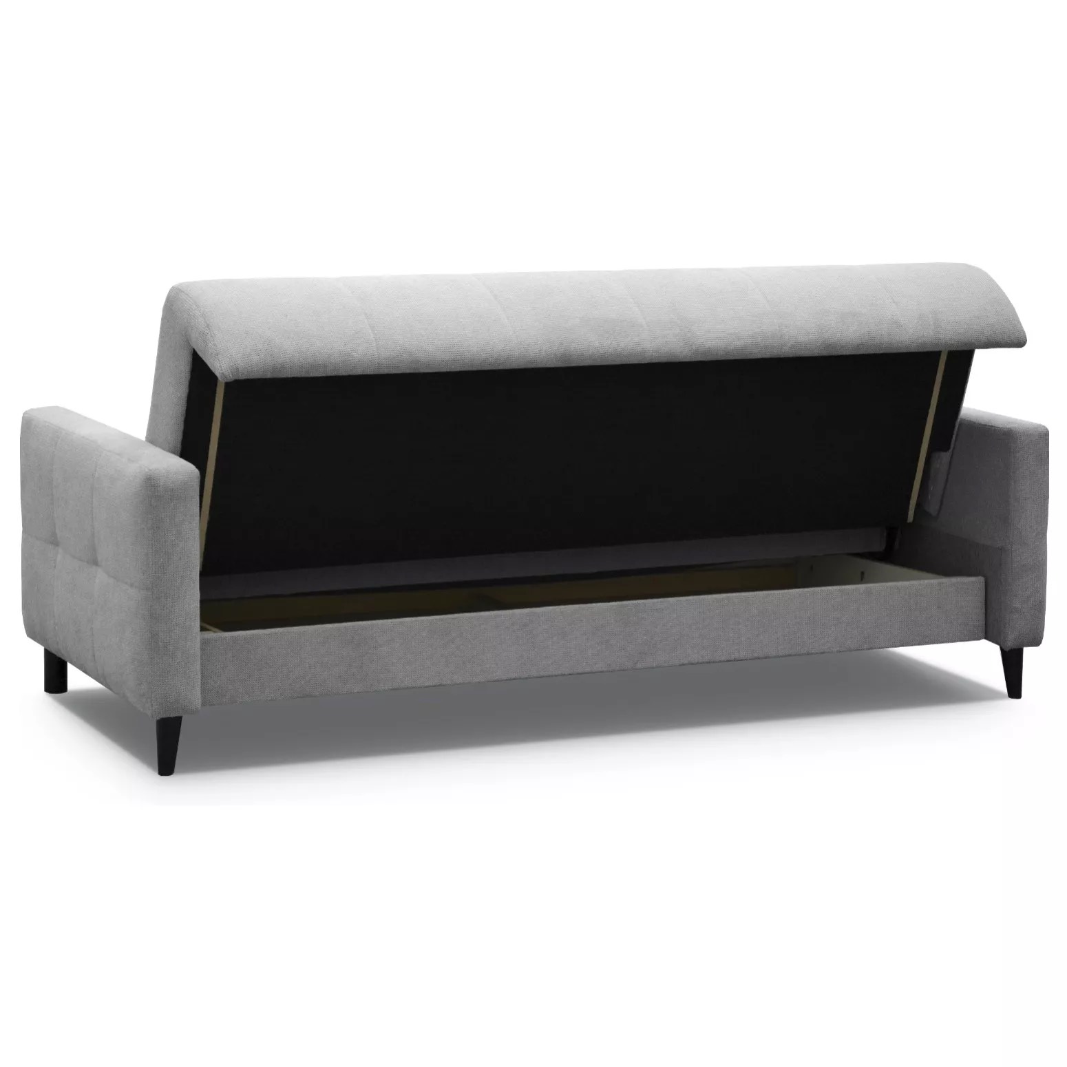 Čalouněné polštářky využijete při odpočinku. Pohovka stojí na dřevěných nožkách, takže se nemusíte příliš omezovat při úklidu. Prostorný úložný prostor se nachází pod sedákem. Pohovka se rozkládá pomocí klasického systému click-clack – rychle ji rozložíte, aniž byste museli nábytek přesouvat po podlaze.